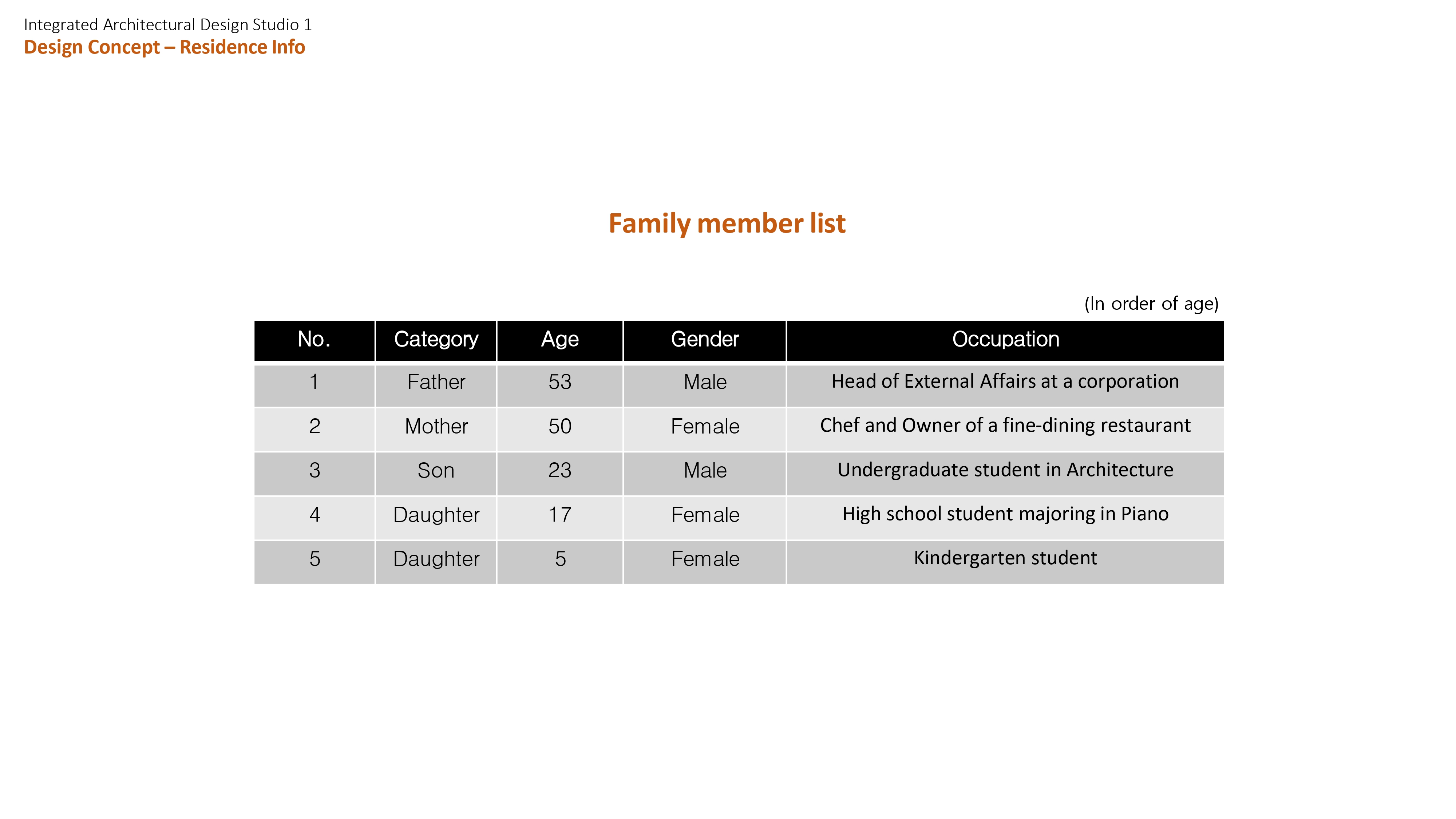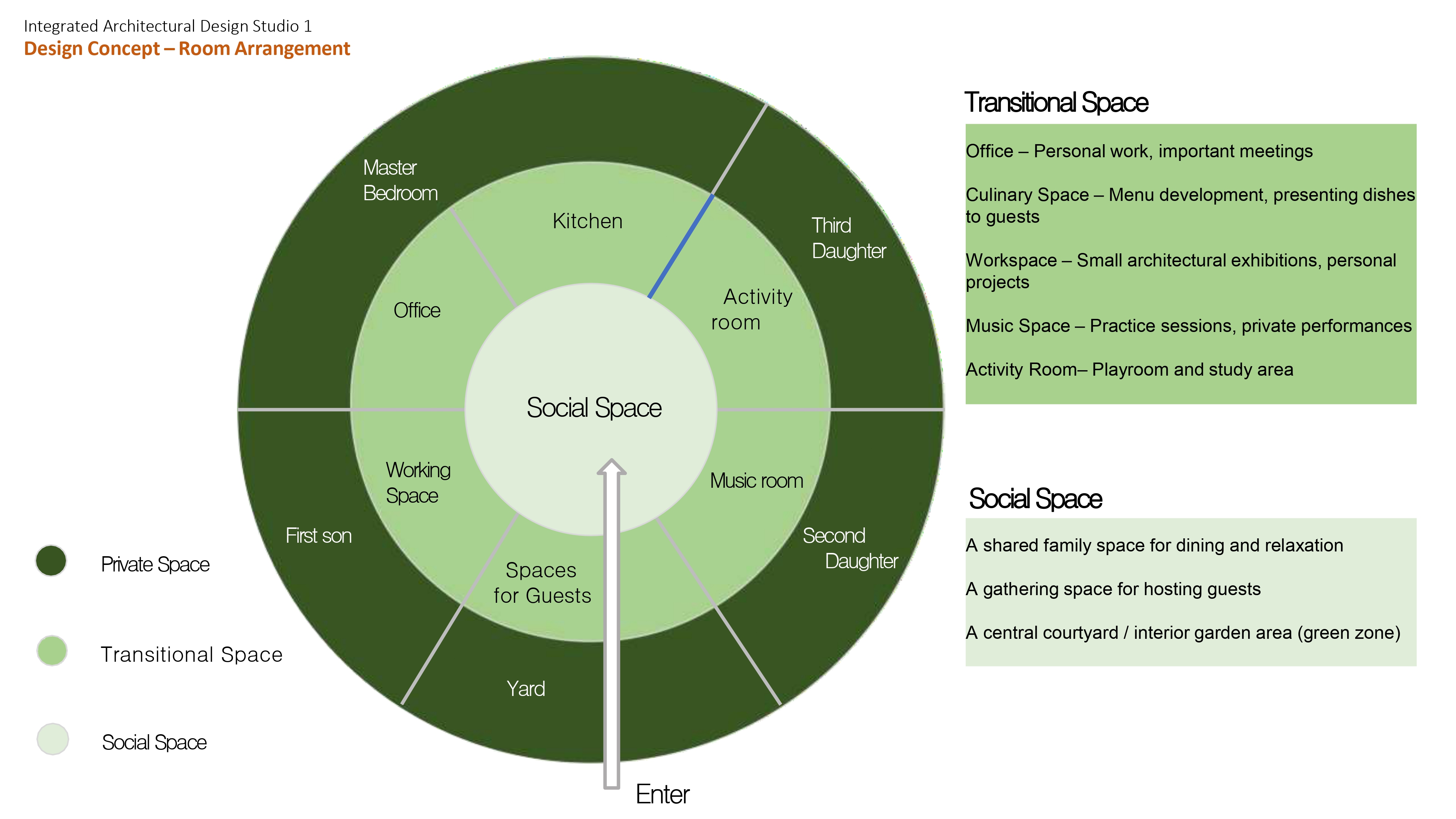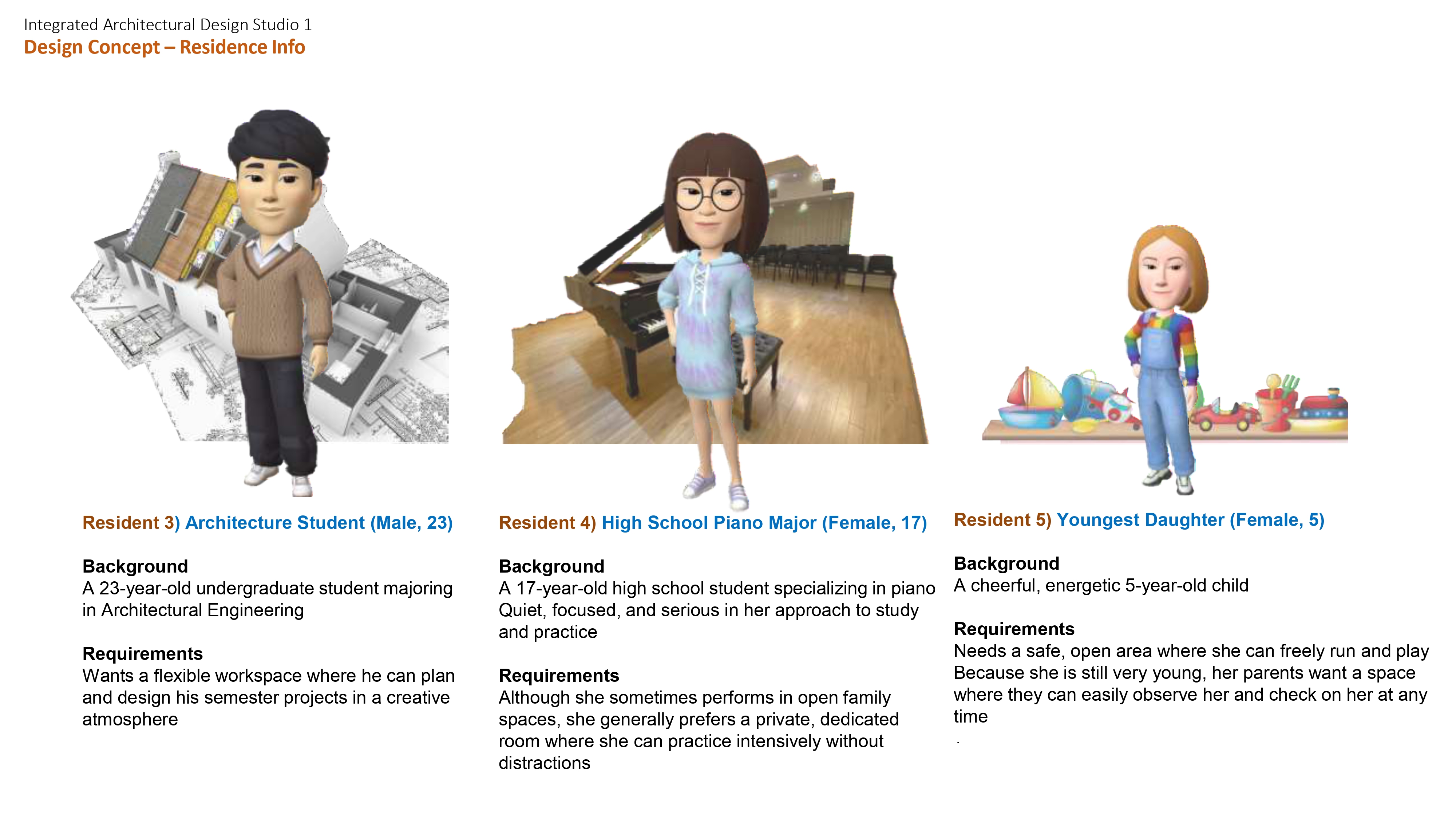 The design concept is grounded in the diverse lifestyles of the five residents and the way their daily routines inform spatial needs and shared interactions. It is organized into two key components: